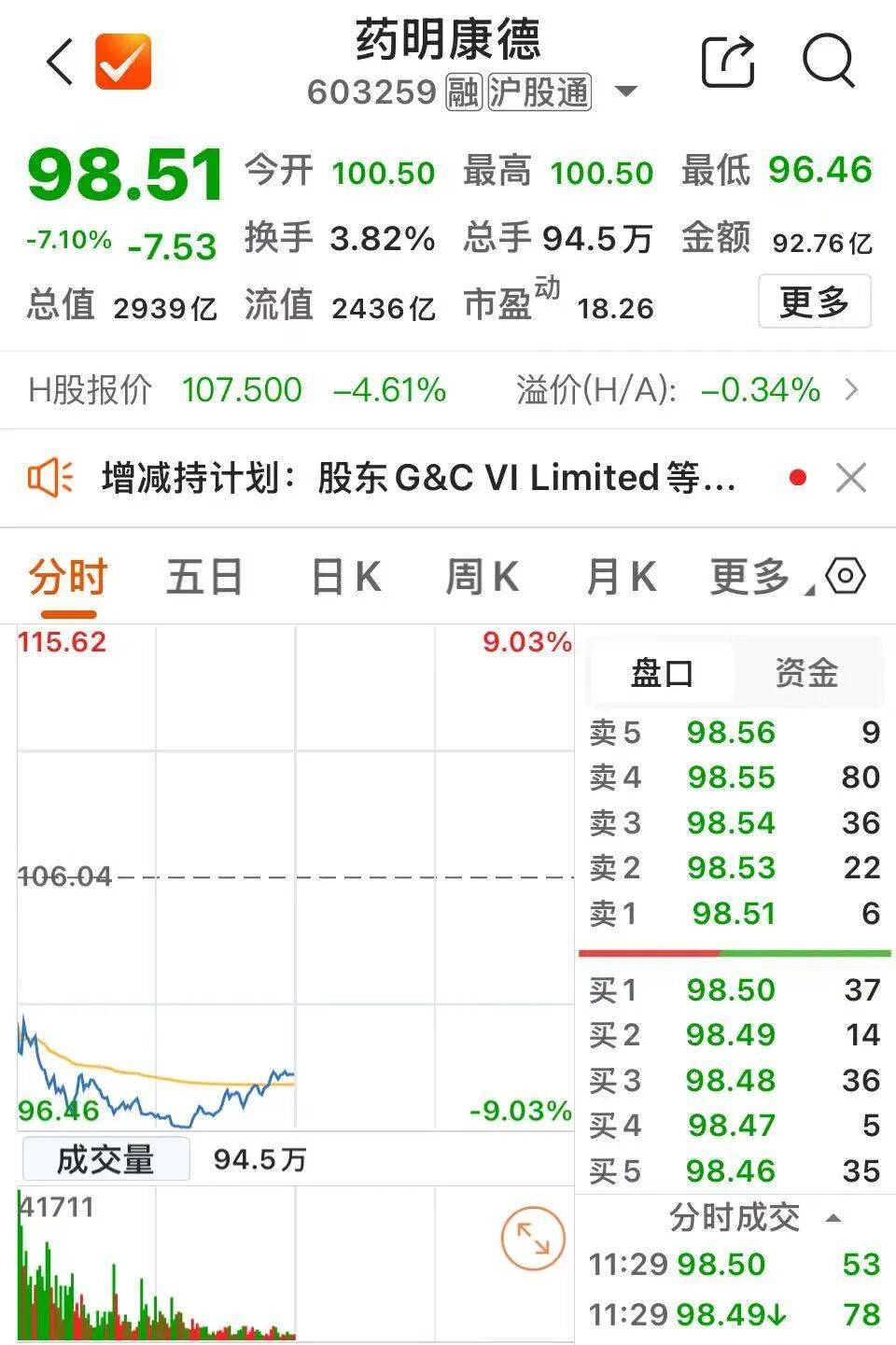 热点股方面,早盘,CRO龙头药明康德股价大幅下挫,药明康德H股一度跌超7%,药明康德A股一度跌超9%。消息面上,药明康德昨晚披露股东减持公告,公司实际控制人控制的股东拟减持公司股份,减持数量不超过公司总股本的2%。