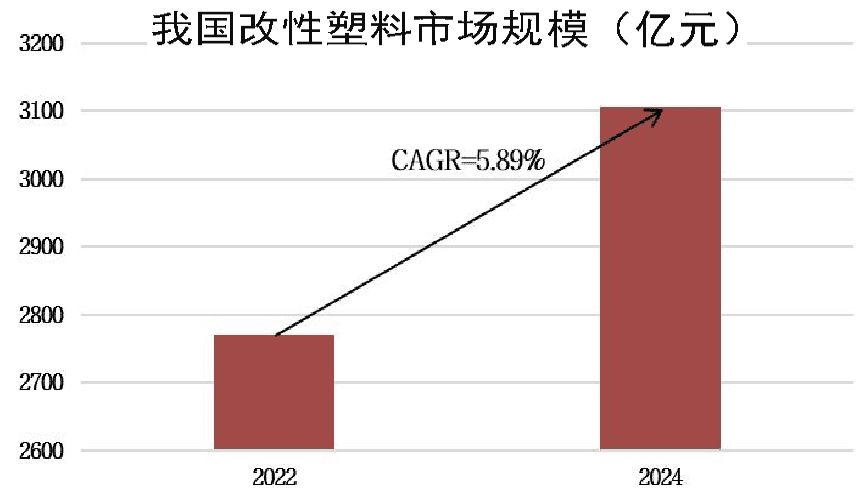 数据显示,2022年我国改性塑料市场规模约为2771亿元,2023年市场规模达2939亿元,2024年突破3100亿元,年复合增长率在5.89%。