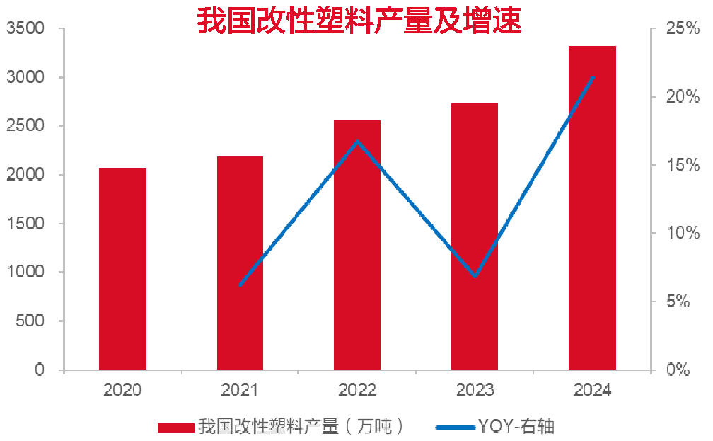 此外,2016-2021年我国改性塑料产量由1563万吨提升至2650万吨,年均复合增速是11.14%,2022年产量达到2884万吨,2024年增至3421万吨。