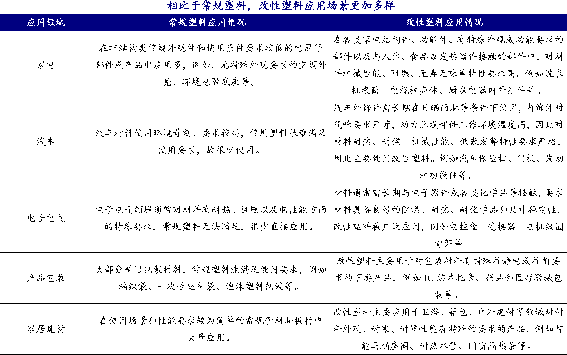 相比常规塑料,改性塑料具有质轻、性能优异的特点,被广泛的应用在家用电器、汽车零部件、电子电气、产品包装、家居建材等使用场景复杂、材料性能要求高的领域。