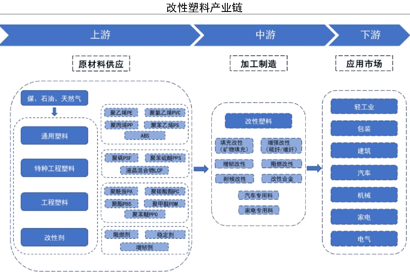 从产业链来看,主要涉及上游原材料供应、中游加工制造和下游应用市场。其中上游材料一般为PE、PP、PVC等各种通用塑料、工程塑料及各类添加剂预改性填充材料。经过改性后塑料将会具备更优秀的强度、韧性、阻燃、抗冲击、易加工等性能,从而不断拓宽其下游应用范围。