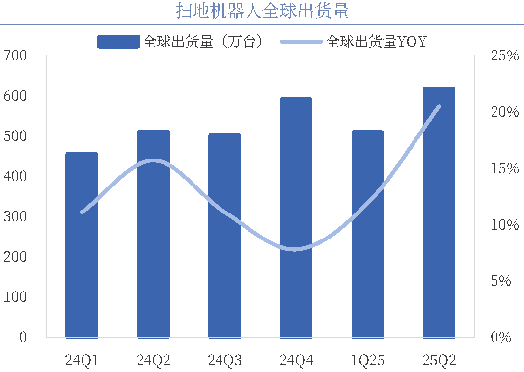 数据显示,2024年全球智能扫地机器人出货量达到2060万台,同比增长11.2%。2025Q1出货量510万台,2025Q2出货量617万台,预计全年出货量将达2310万台,2028年有望提升至3150万台。