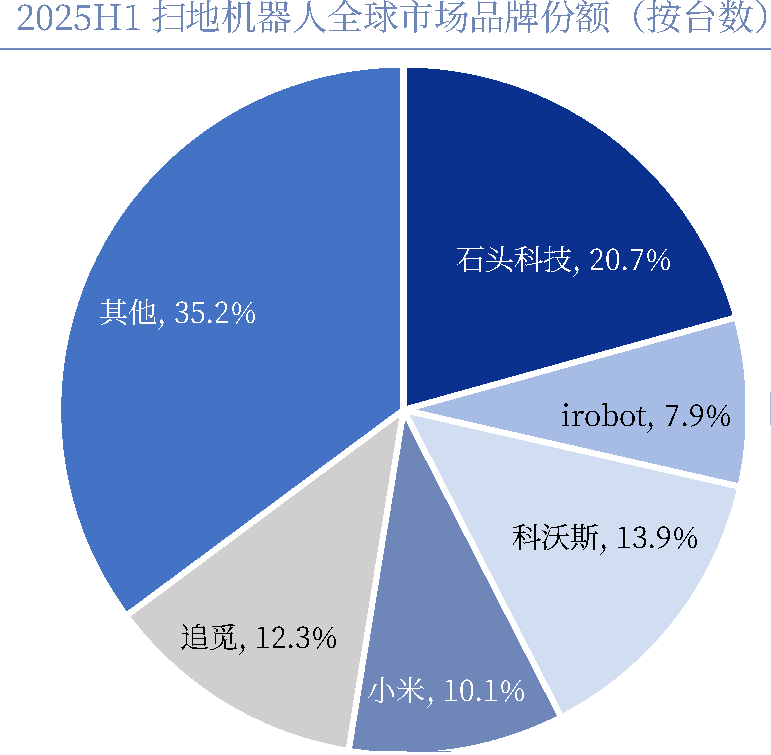 从市场竞争格局来看,2025H1石头科技、irobot、科沃斯、小米、追觅在全球市场份额中分别占比20.7%、7.9%、13.9%、10.1%、12.3%。石头科技全球量额双第一,已超过irobot。TOP5合计出货量已占据整体市场的64.8%,且它们之间的份额差距也在不断缩小。