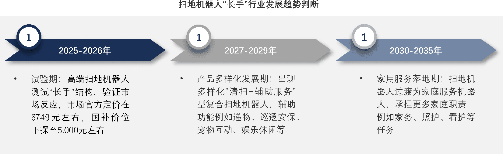 第5代扫地机器人即“长手”扫地机器人,诞生于具身智能和智能机器人发展背景下。以追觅科技和石头科技扫地机器人“长”出仿生机械手为代表。在全能扫地机器人基础上长出仿生机械臂,增加物品整理和清洁配仓。