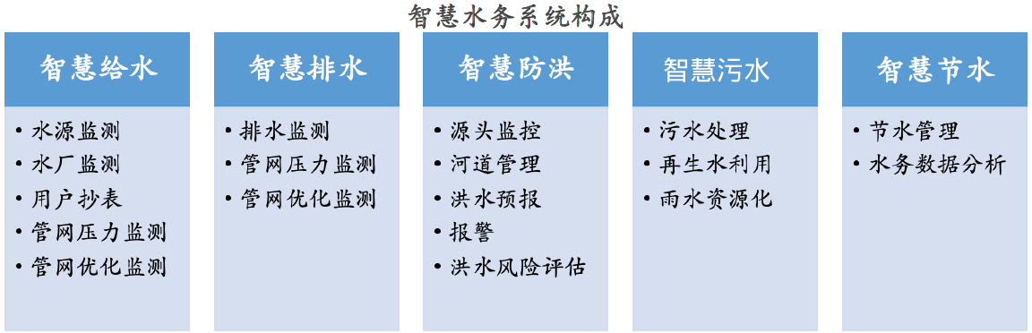智慧水务以云计算、大数据、物联网等新一代信息技术为核心,结合人工智能,通过对水表、压力表、流量计、水质仪、液压计等水务基础设施的智能化改造,使其能广泛、精准地传输、储存、处理数据,再经过软件平台、智能AI、大数据等智能系统,对水务信息数据进行整合分析处理,并最终为决策提供支持,实现在水务管理能力、水资源利用效率、水务服务等方面的提高。智慧水务包含给水、排水、防洪、污水、节水等多领域的智慧化改造。