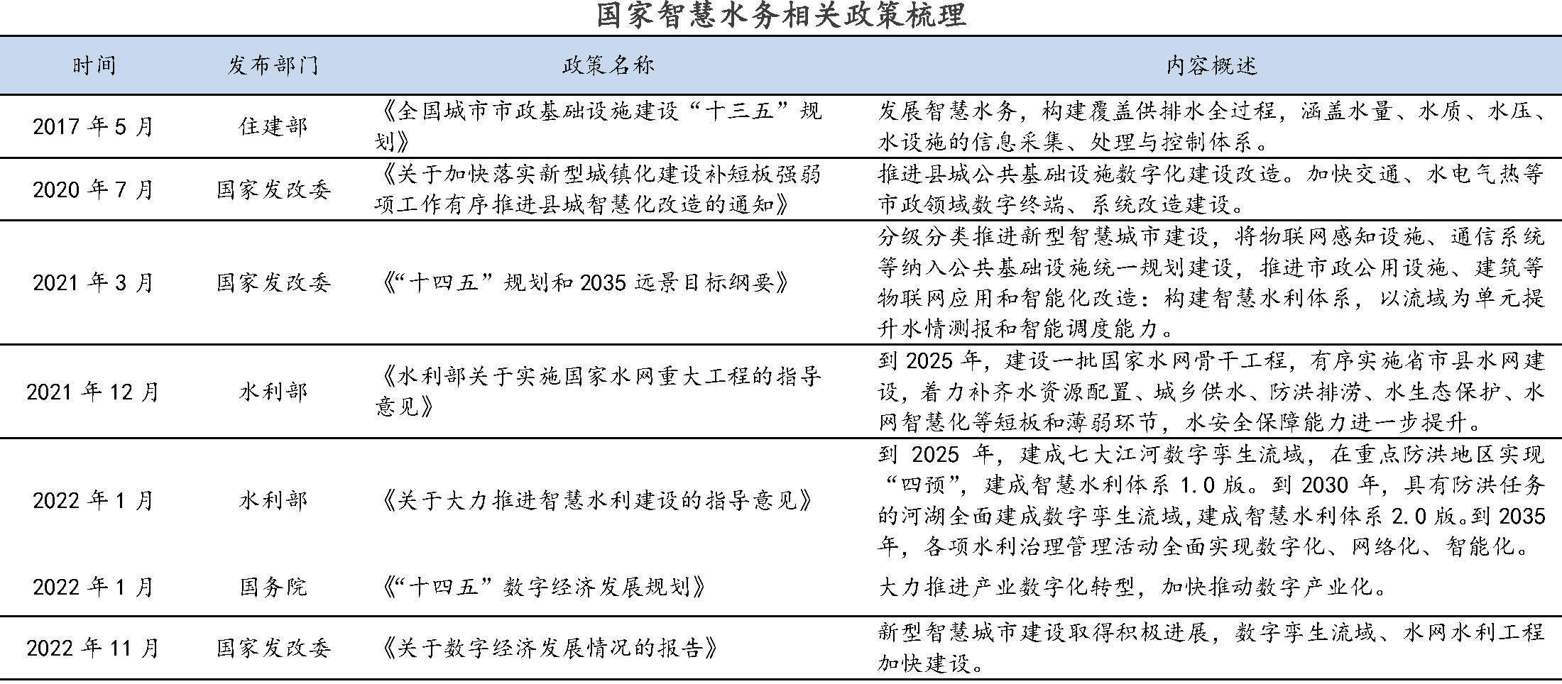 智慧水务作为“数字中国”在公用事业行业的实质性探索,过去几年受到不少的政策支持和鼓励。2017年5月,住建部发布《全国城市市政基础设施建设“十三五”规划》,提出要大力发展智慧水务,覆盖供水排水中的各个环节,包括水质监测、供水设备检查、整治黑臭水体等方面,加强供水设备的信息化技术,提高供水的安全保障能力,提升水资源的利用率。2021年3月,国家发改委印发《“十四五”规划和2035远景目标纲要》,推动智慧城市建设,将物联网设备纳入公共基础设施,构建智慧水务体系,推进农饮水工程建设。