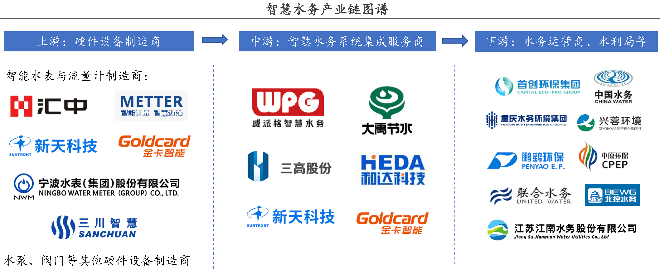从产业布局来看,上游为水表、水泵、阀门等硬件设备制造商以及信号传输服务商,其中智能水表与流量计为最重要的基础核心设备,目前市场上的智能水表相关上市公司分别为汇中股份、迈拓股份、新天科技、金卡智能、宁水集团、三川智慧等。中游为系统集成服务商,相关的上市公司包括威派格、大禹节水、三高股份、和达科技、新天科技、金卡智能等,它们一般拥有核心软件系统,向上游采购硬件设备后将整套软硬件一体的智慧水务系统销售给下游的水务企业或政府水利单位等。