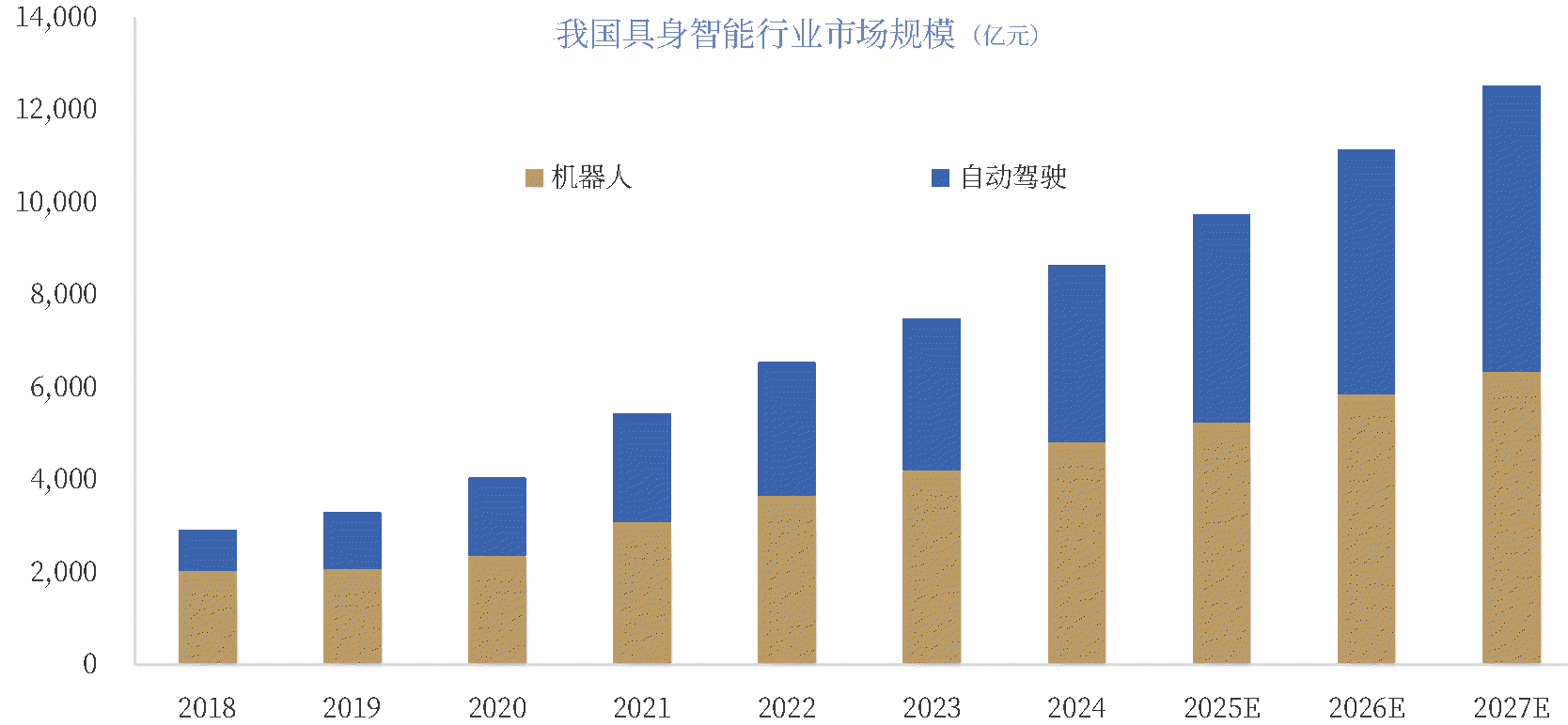 数据显示,2024年我国具身智能市场规模达8634亿元,同比增长65%。预计2025年市场规模将突破9731亿元,其中机器人市场规模预计可达5229亿元,同比+8.9%,自动驾驶市场规模预计可达4502亿元,同比+17.5%,2026年市场规模预计将超万亿元,2030年有望突破4万亿元。