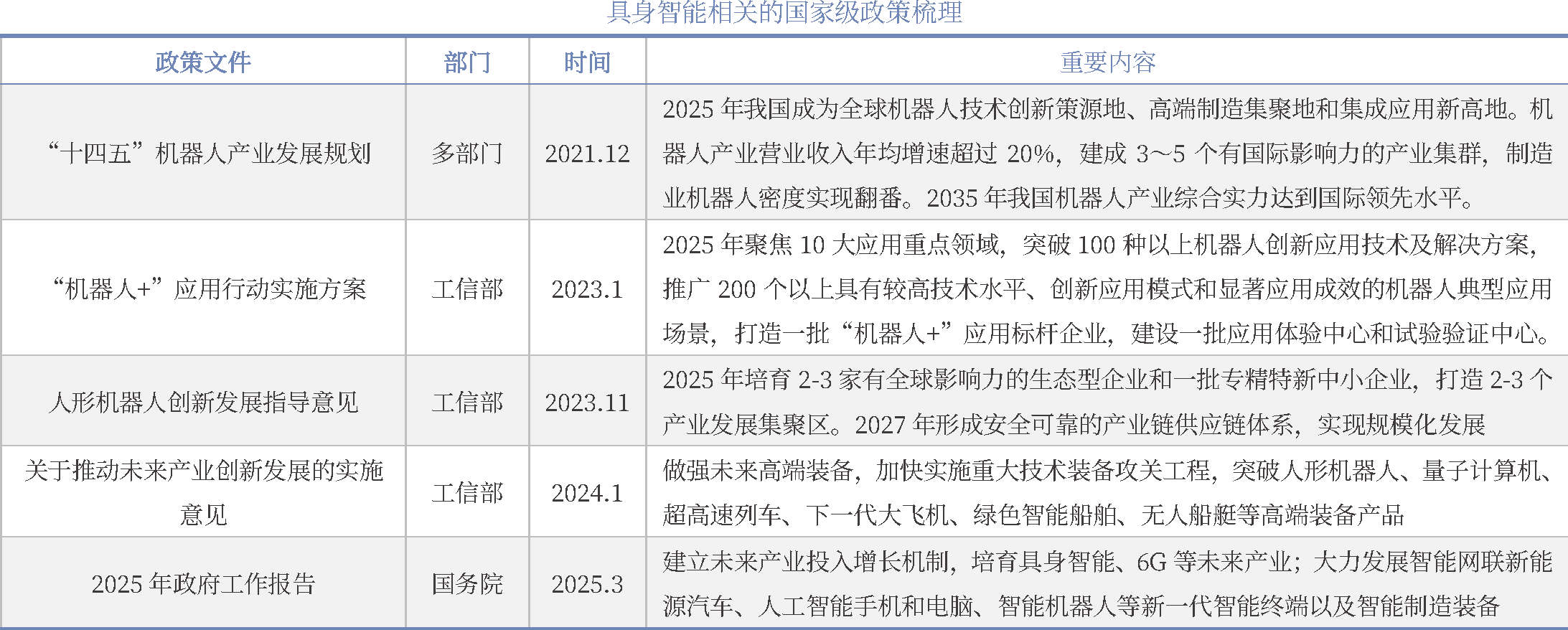 “十四五”时期,我国具身智能相关方向纳入国家发展主线,2023年底工信部发布《人形机器人创新发展指导意见》,对人形机器人这一具身智能终极载体首次提出明确规划;2025年具身智能首次进入政府工作报告并被列为未来产业。