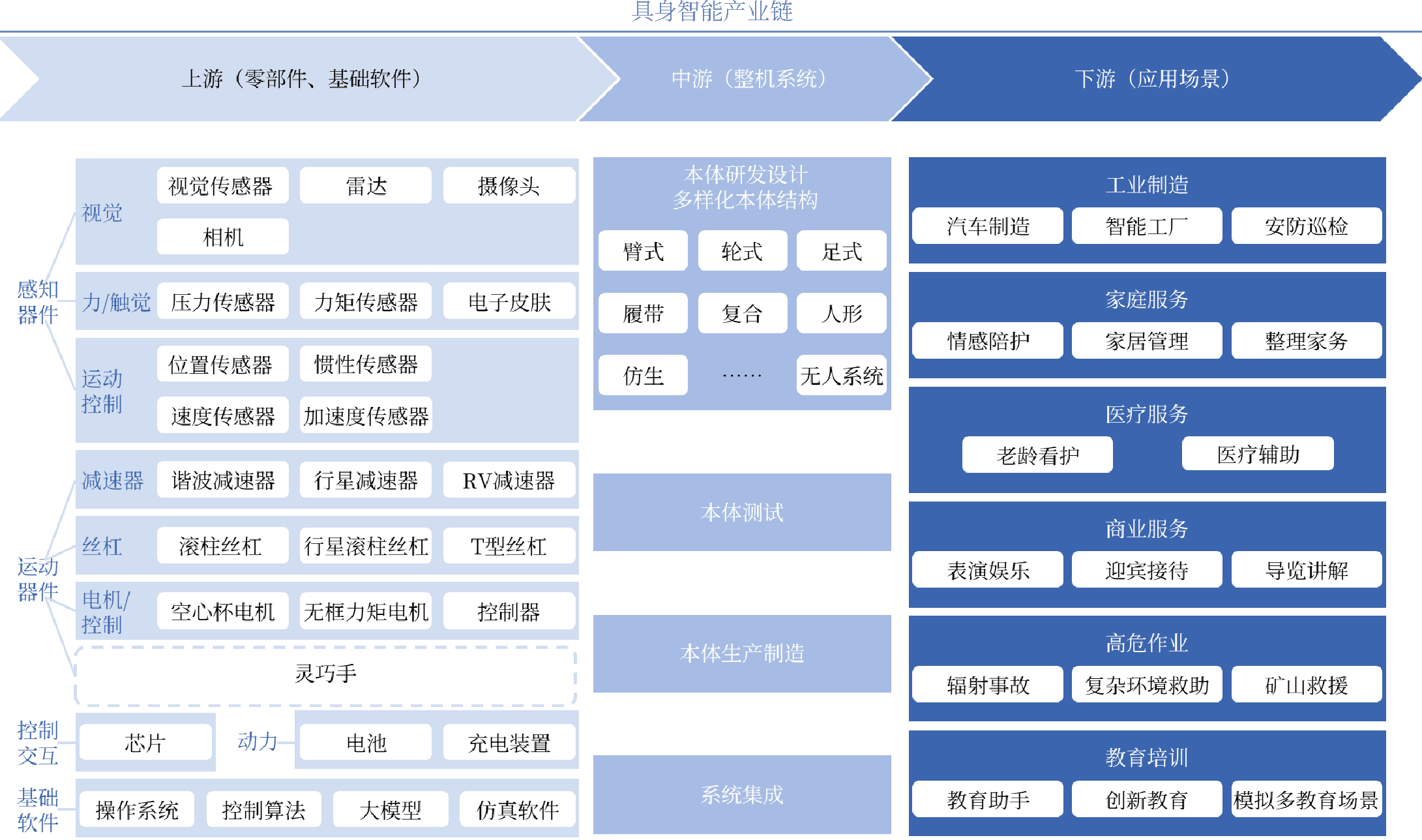 具身智能产业链涵盖多个环节,上游包括零部件和基础软件,中游包括整机系统研发设计、本体测试、生产制造、系统集成,下游覆盖科研教育、商业服务、工业制造、高危作业、医疗康养、家庭服务等应用场景。