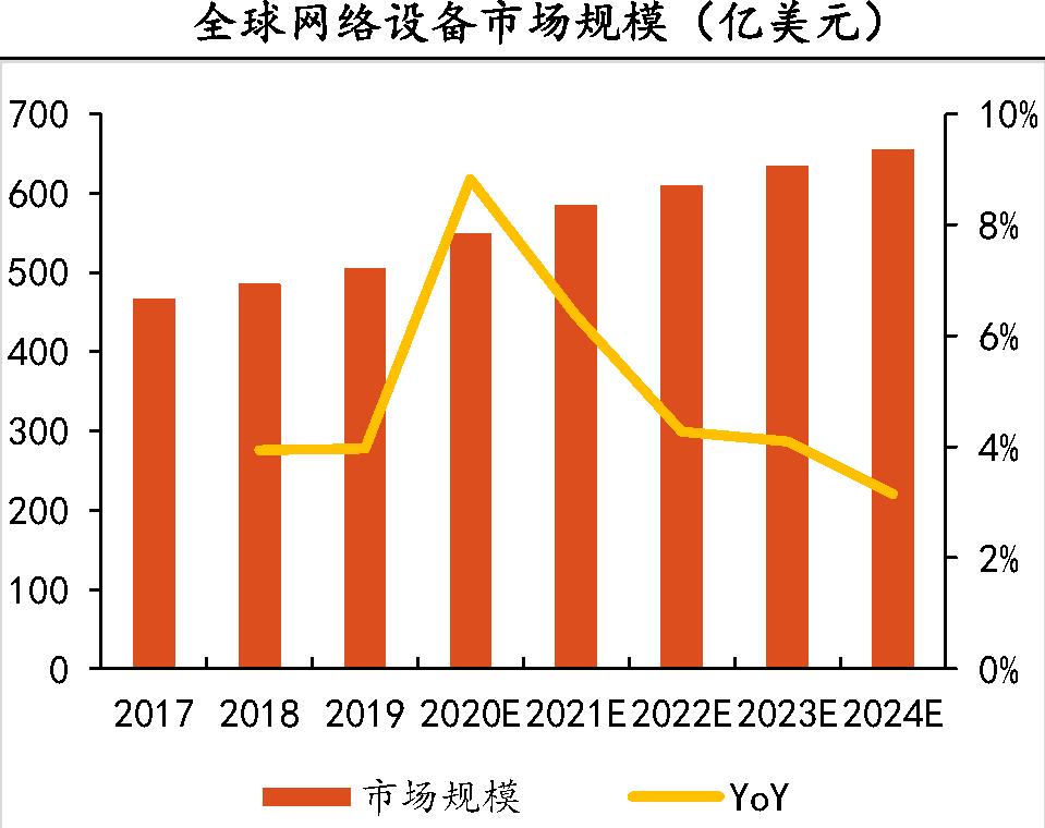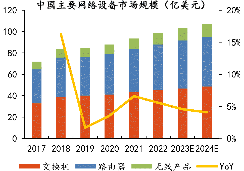 数据显示,2022年全球网络设备市场规模约为610亿美元,至2024年有望超650亿美元,5年复合增长率近5.3%。