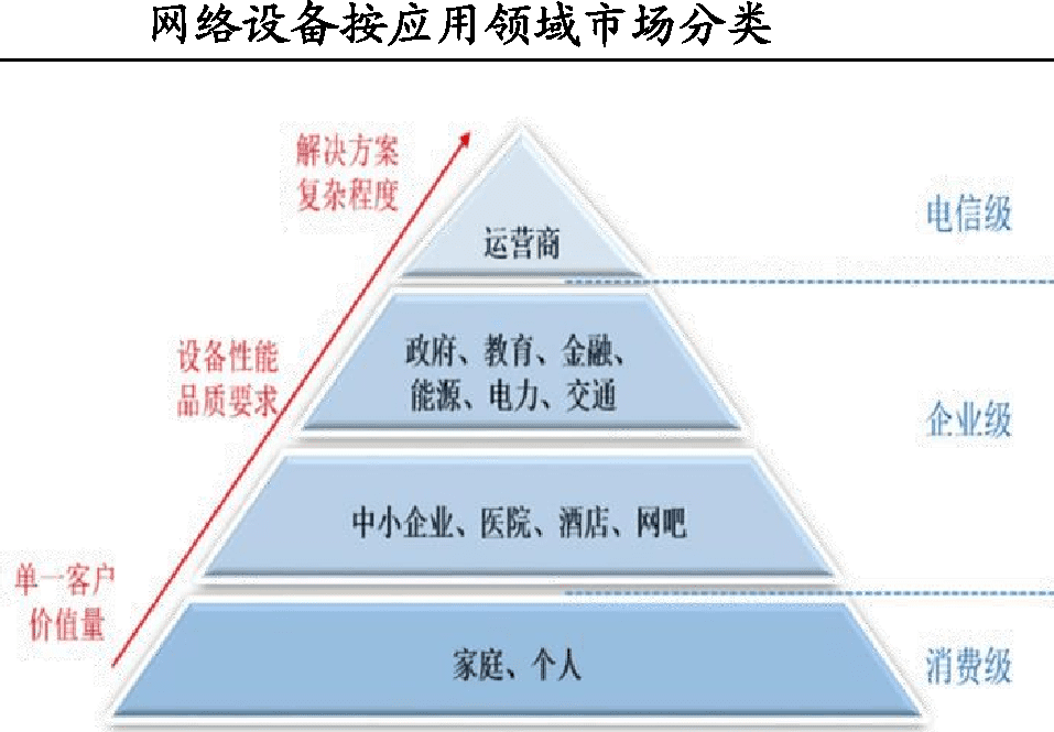 其中电信级网络设备主要应用于电信运营商市场,用于搭建核心骨干互联网;企业级网络设备主要应用于非运营商的各种企业级应用市场,包括政府、金融、电力、医疗、教育、制造业、中小企业等市场;消费级网络设备主要针对家庭及个人消费市场。