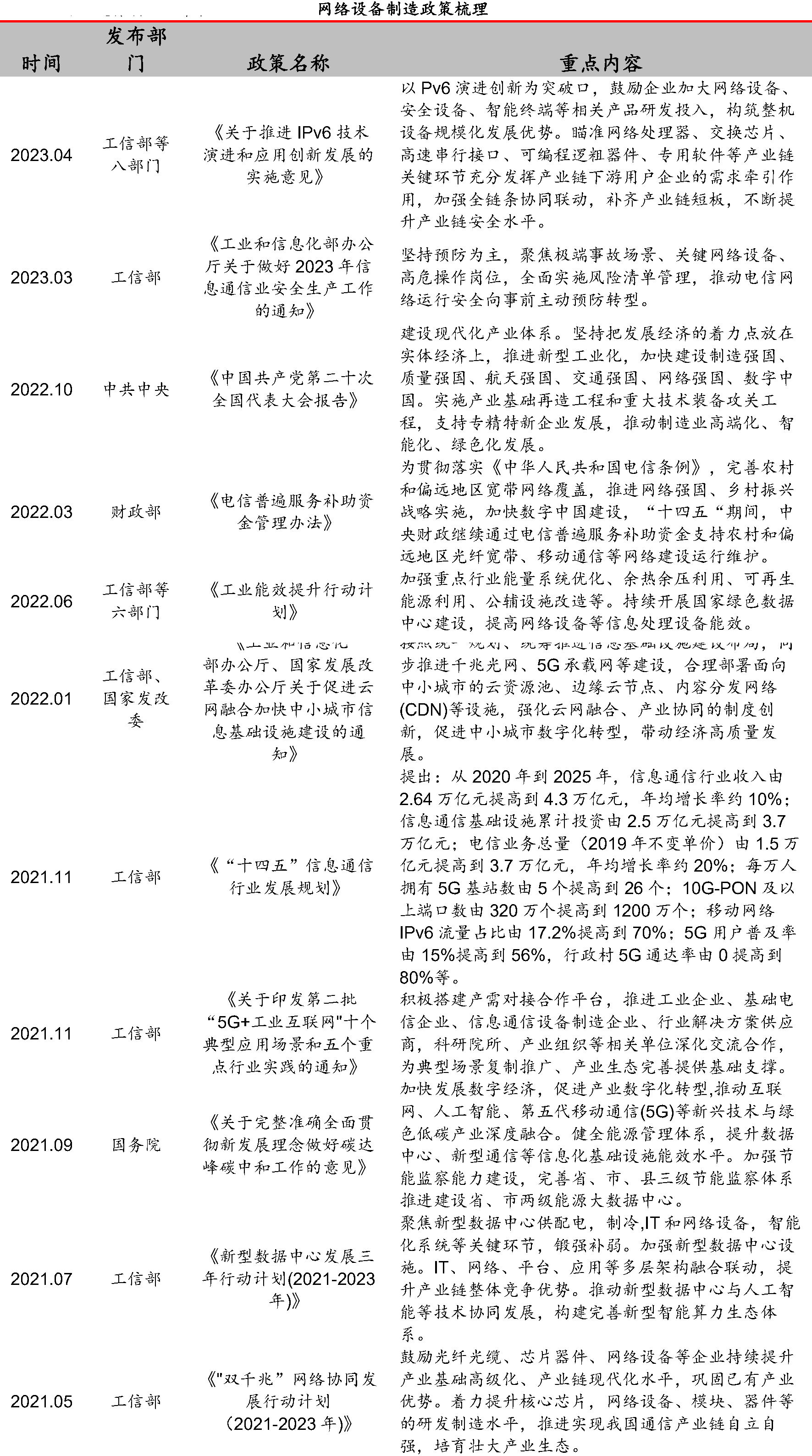 2023年4月工信部等八部门联合发布《关于推进IPv6技术演进和应用创新发展的实施意见》,提出要以Pv6演进创新为突破口,鼓励企业加大网络设备、安全设备、智能终端等相关产品研发投入;“十四五”规划提出要加快5G网络规模化部署,用户普及率提高到56%,推广升级千兆光纤网络,同时前瞻布局6G网络技术储备,实施中西部地区中小城市基础网络完善工程。