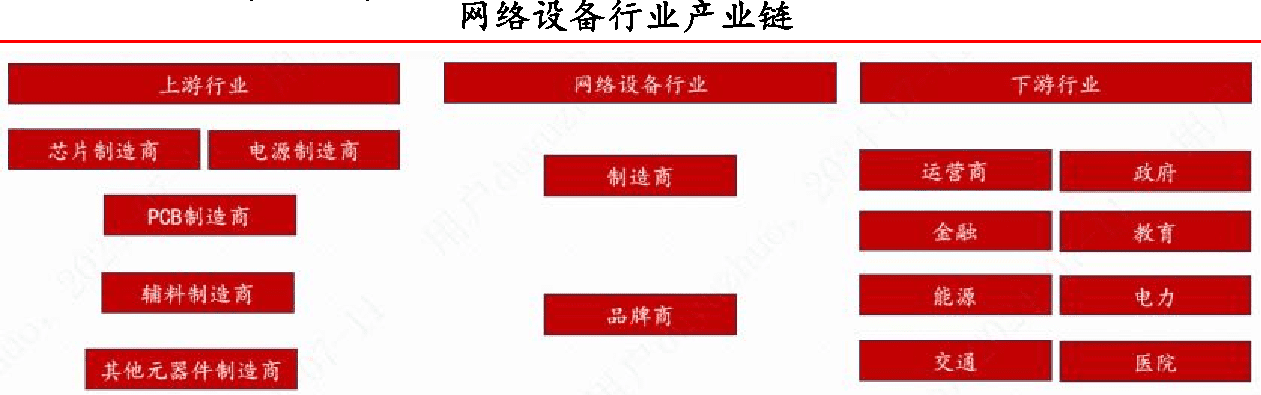 从产业链来看,上游包括芯片、PCB、电源、各类电子元器件厂商,中游为制造商和品牌商,下游应用领域包括运营商、政府、金融、教育、能源、电力等对网络化、信息化有需求的各行各业。